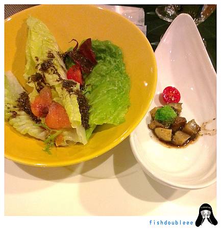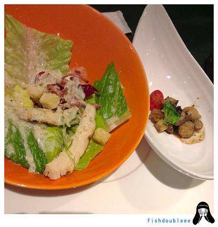 我們的開胃菜(乾煎雙菇佐巴薩米克老醋汁)是和沙拉一起上的!